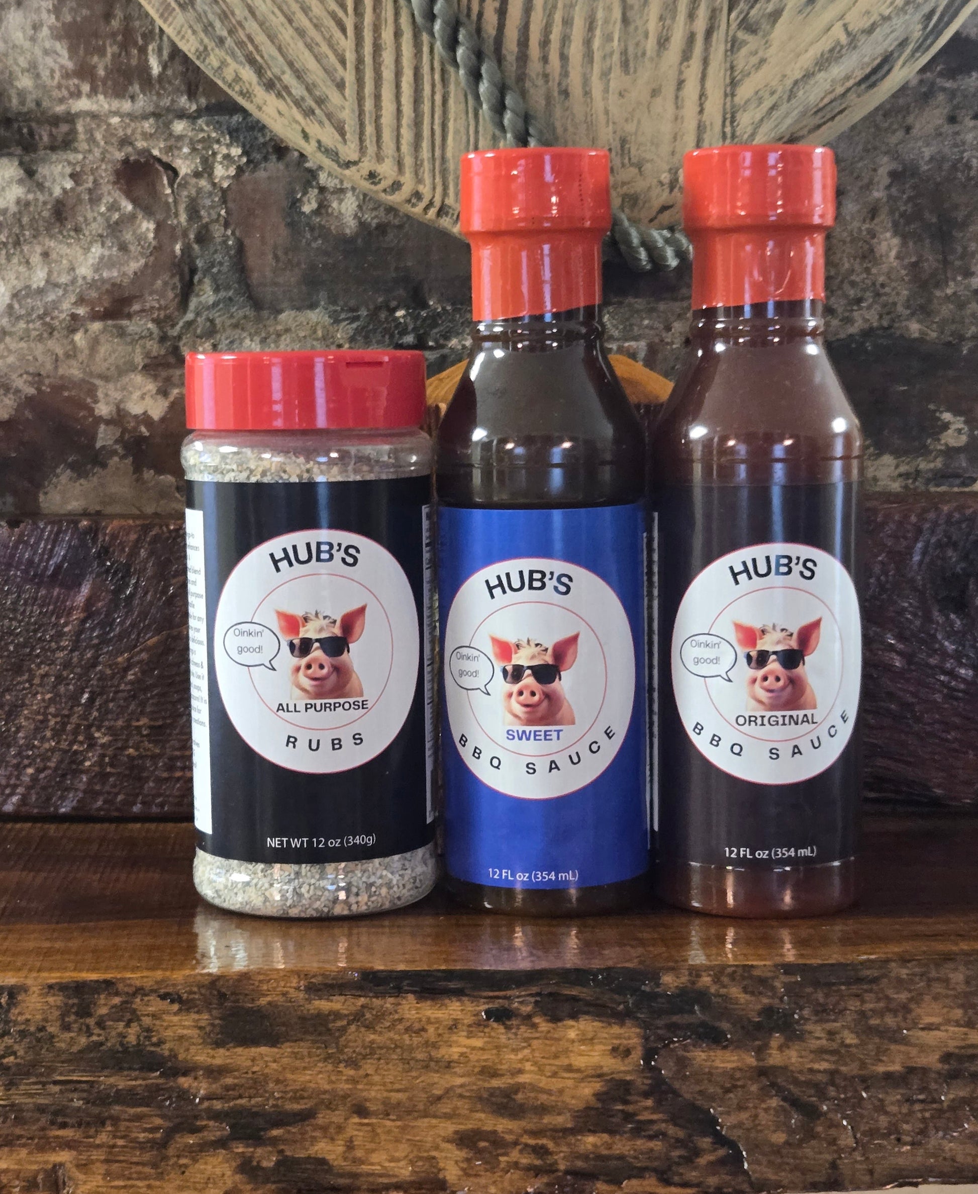 Hub's Barbecue Sauce and Rub's Gift Set: A trio of flavor-packed sauces and rubs crafted for grill master's and food lovers alike. Perfect for any occasion!